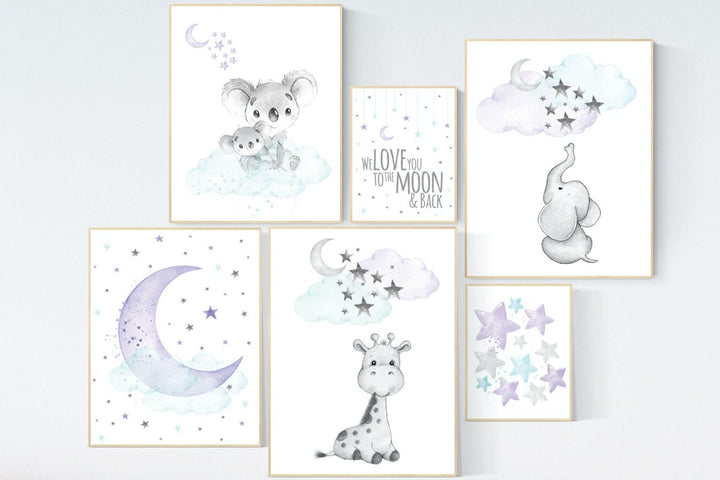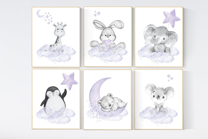 Purple nursery wall art, animal nursery, elephant, giraffe, puppy, woodland animals, lilac nursery decor, lavender, girl nursery, moon stars
