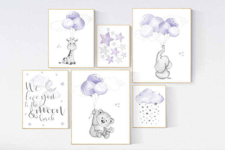 Purple nursery wall art, animal nursery, elephant, giraffe, bear, woodland animals, lilac nursery decor, lavender, girl nursery, moon stars