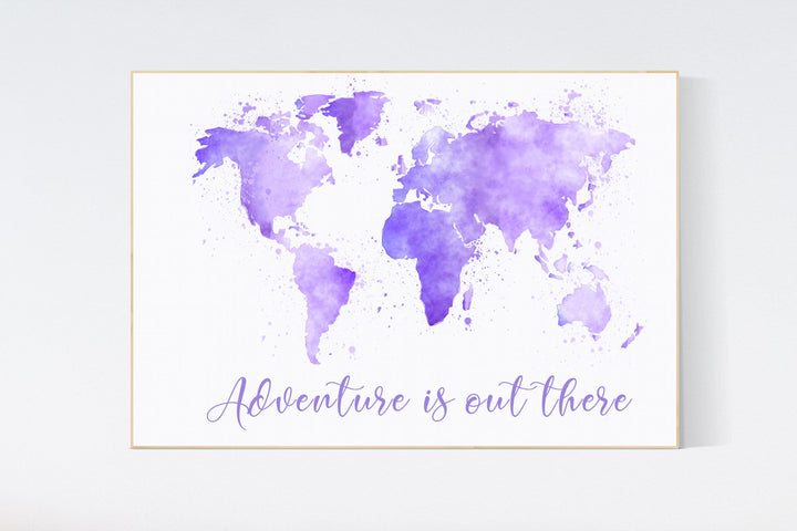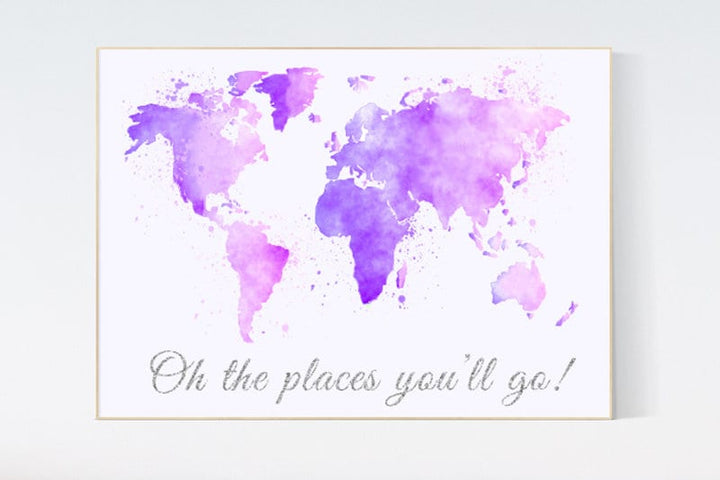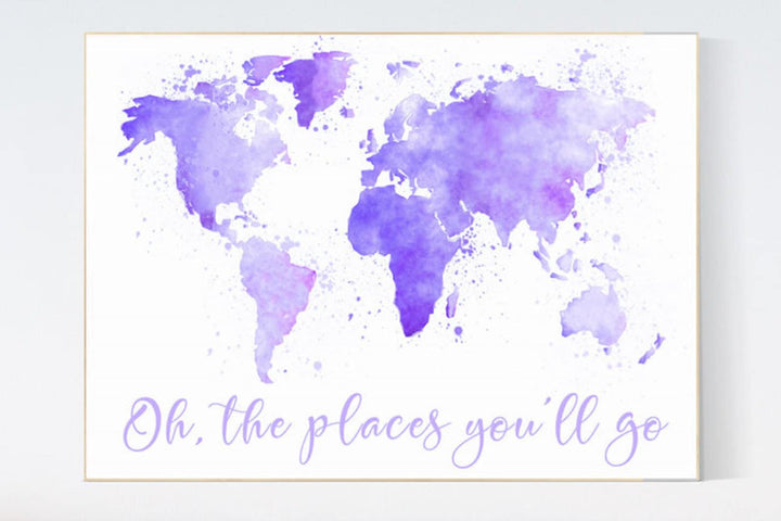 Purple World map watercolor, Oh the places you will go nursery, world map nursery print, nursery art print, lilac, lavender, world map