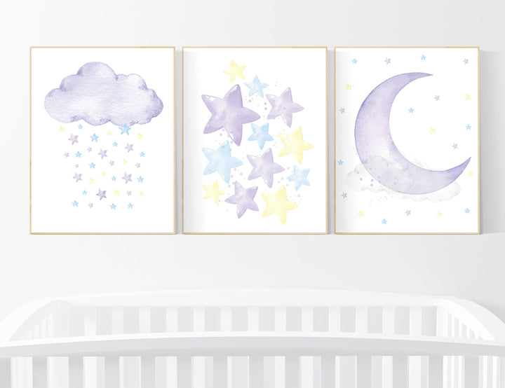 Purple yellow blue nursery, stars, cloud, moon nursery, nursery decor girl, nursery wall decor, set of 3 prints, girls room nursery ideas