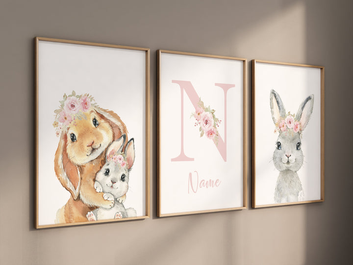 Rabbit nursery, girl nursery, mother and baby rabbit, bunny nursery, floral nursery, rabbit prints, pink nursery, flower nursery
