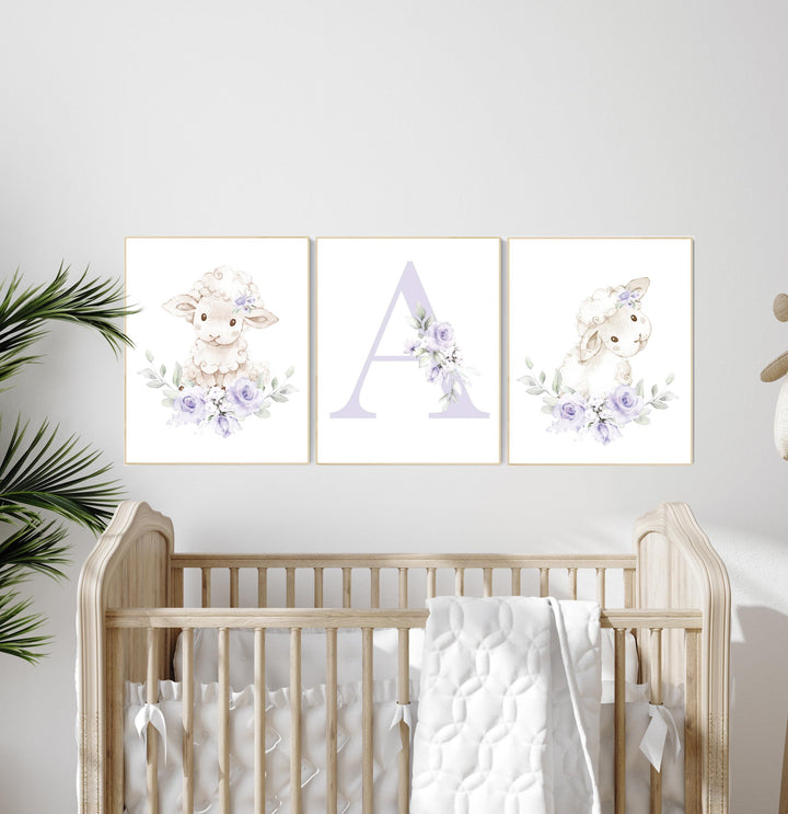 Purple Sheep Nursery Wall Art, Lavender Baby Girl Name Print, Farm Animal Nursery Decor, Custom Initial Floral Sheep Print Set