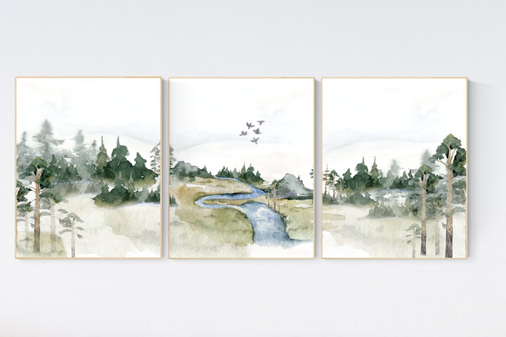 River nursery theme, forest view, landscape nursery, tree nursery decor, green nursery, woodland nursery decor, river view, waterfall