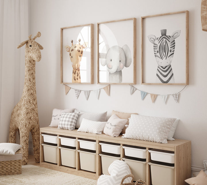 Safari Animal Nursery Wall Art Set of 3 - Giraffe Elephant Zebra Prints - Baby Room Decor - Gender Neutral Jungle Animal Poster Set