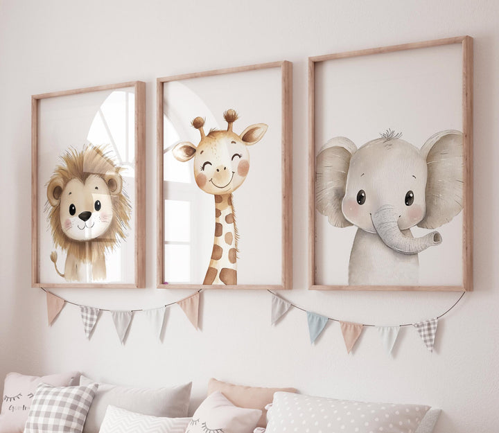 Safari Animal Nursery Wall Art Set of 3, Lion Giraffe Elephant Prints, Neutral Jungle Baby Room Decor, Cute Watercolor Zoo Animals
