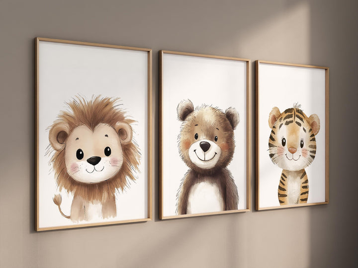 Safari Animal Nursery Prints – Beige Lion, Bear, and Tiger Wall Art for Baby Boy or Girl Room, Jungle Animal Decor Set of 3 Neutral Prints