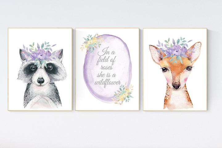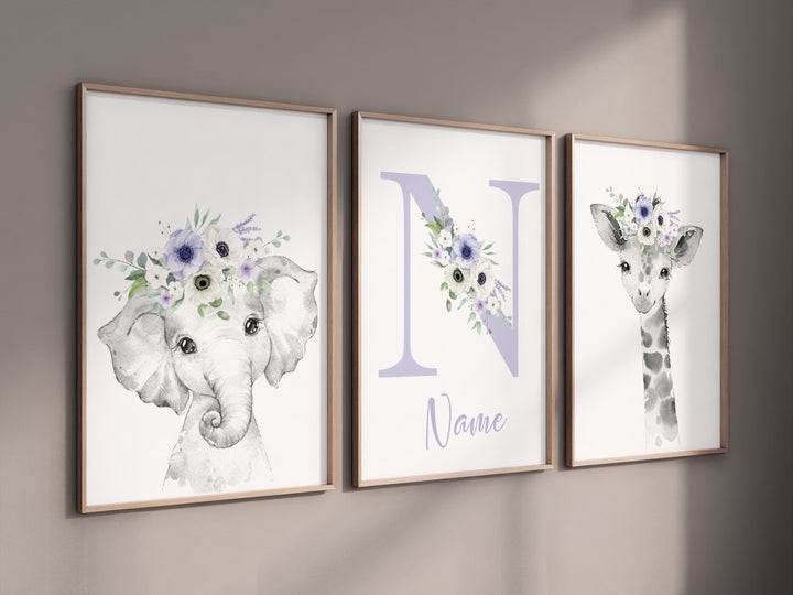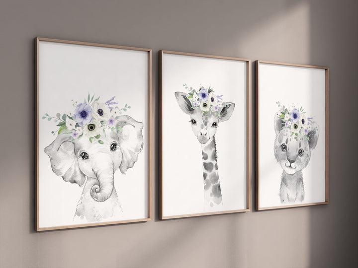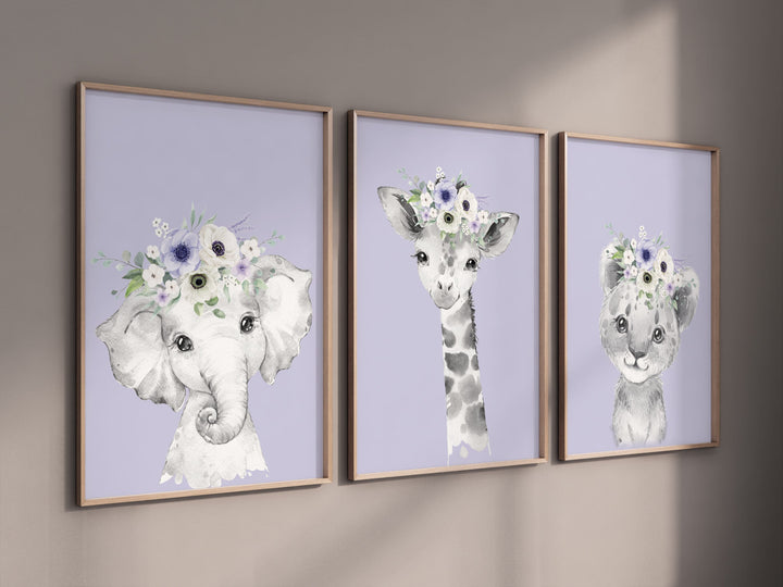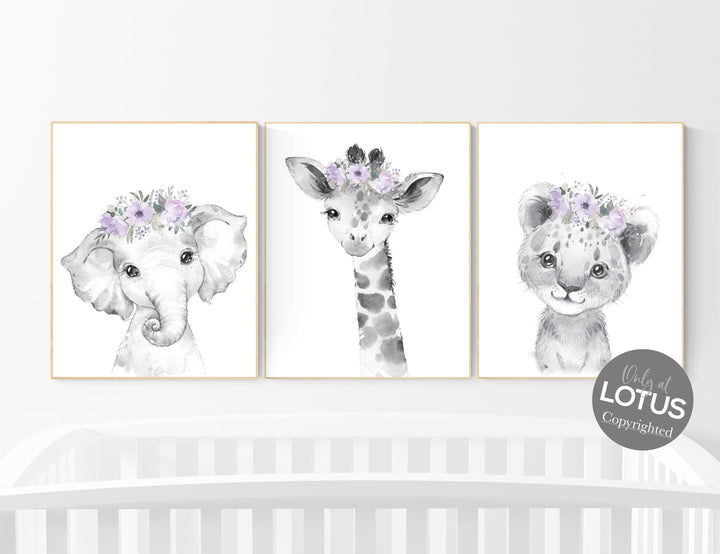 Safari Animals, girl nursery, Animals Prints, Woodland Nursery Decor, Safari Nursery Wall Art, floral animal prints, purple nursery