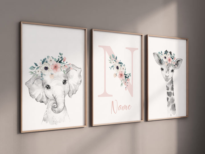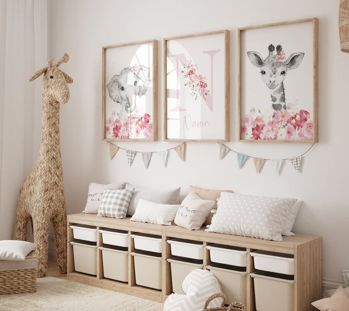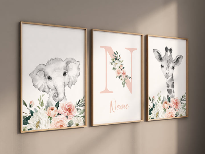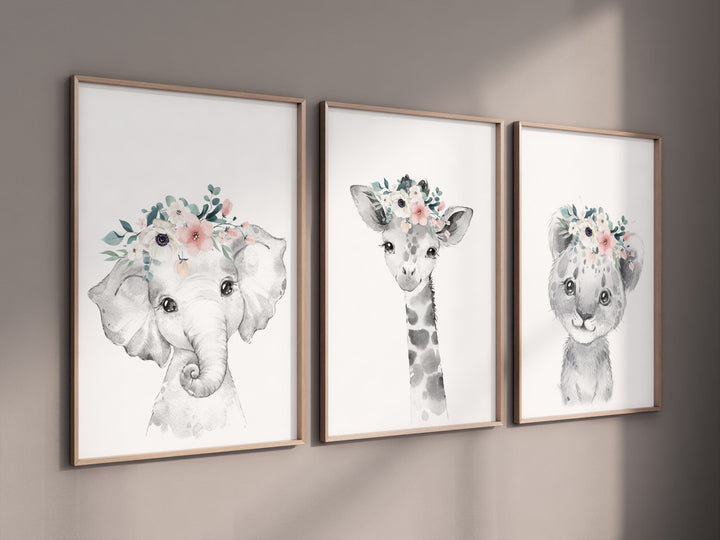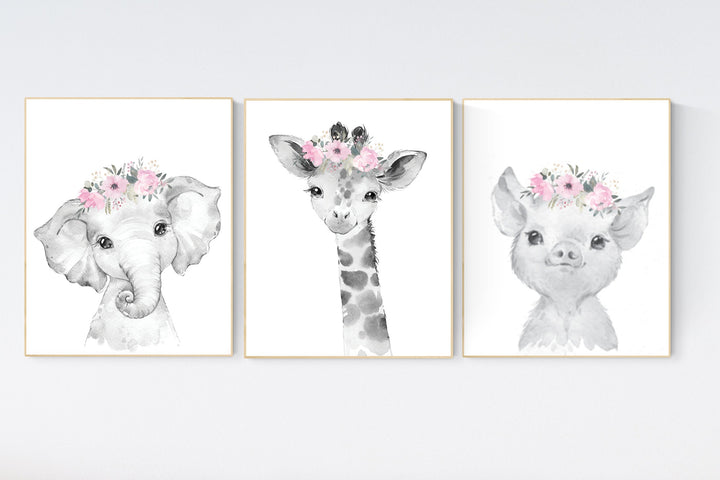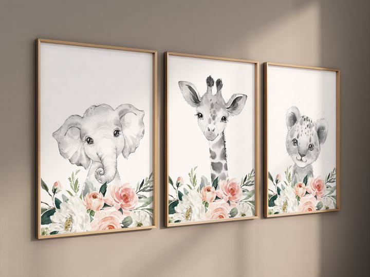 Safari Animals, girl nursery, Animals Prints, Woodland Nursery Decor, Safari Nursery Wall Art, floral animal prints, blush Pink