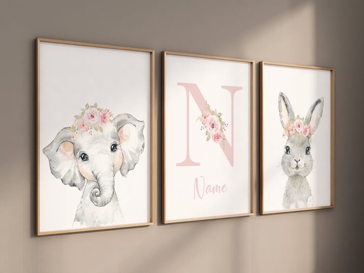 Safari Animals, girl nursery, Animals Prints, Woodland Nursery, elephant nursery, rabbit nursery, floral animal prints, Pink Safari Animals