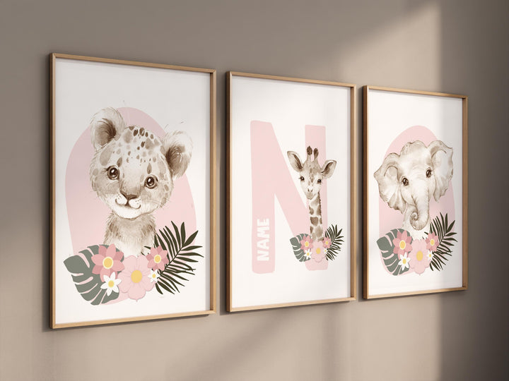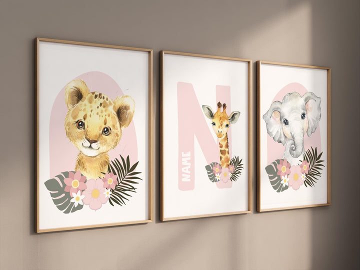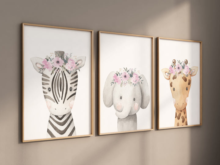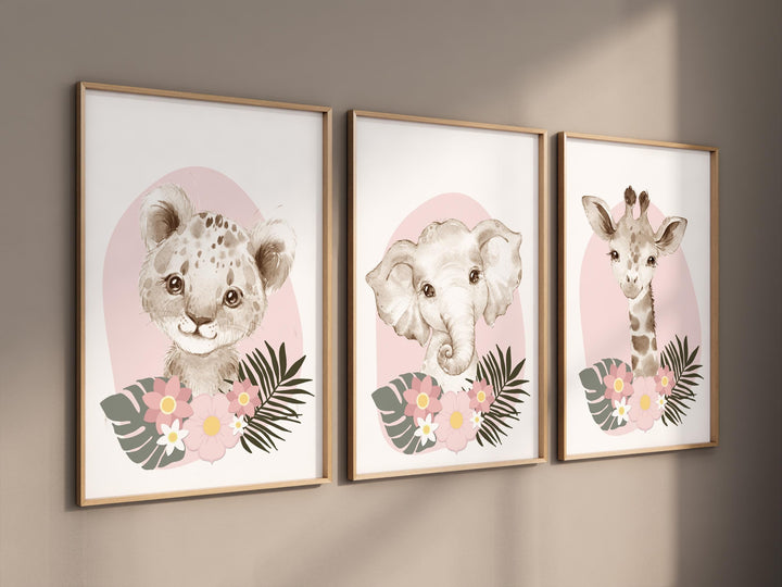 Safari Animals, girl nursery, Animals Prints, Woodland Nursery Decor, Safari Nursery Wall Art, floral animal prints, Pink Safari Animals