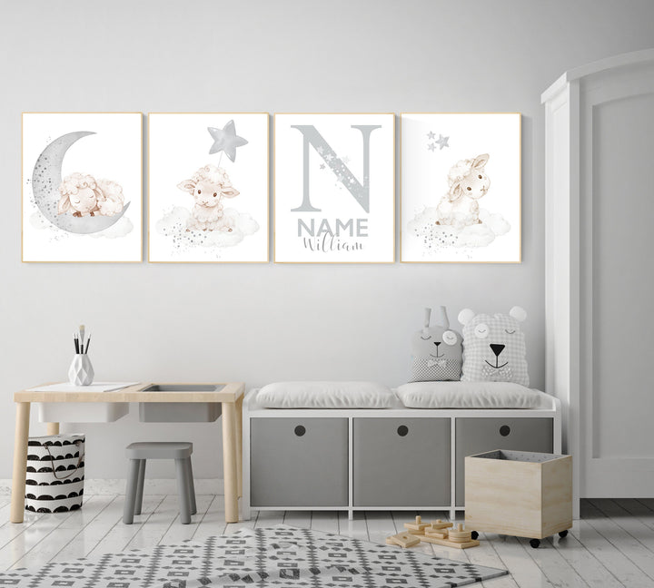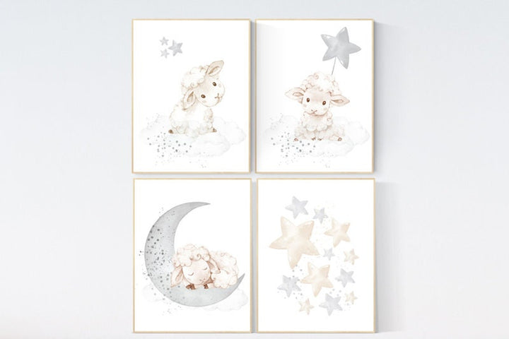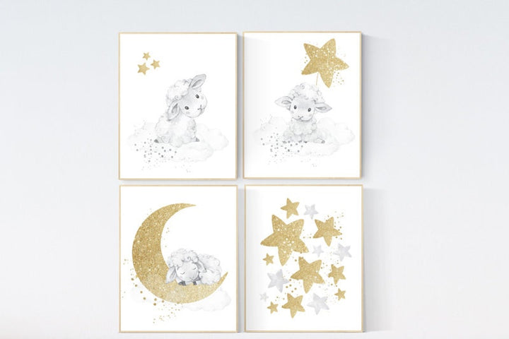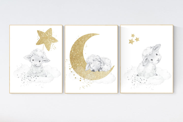 Sheep nursery decor, gold and gray nursery decor, grey, nursery decor lambs, nursery wall art sheep, moon and cloud, gender neutral nursery