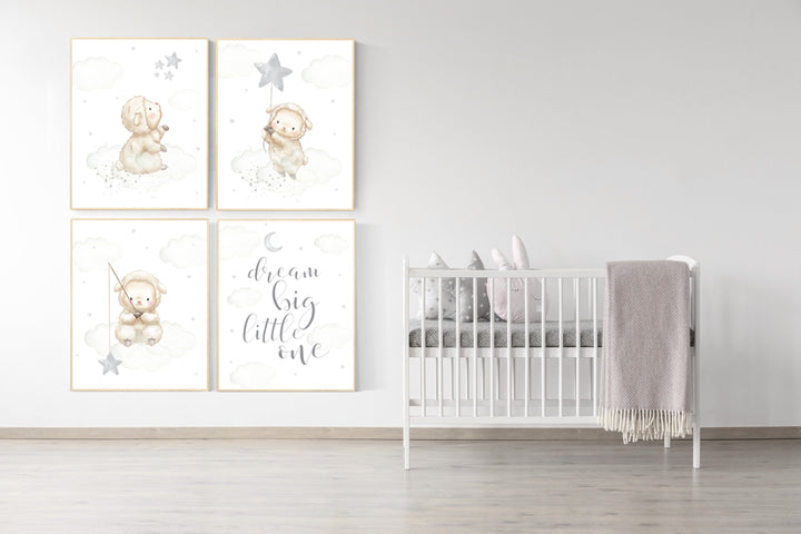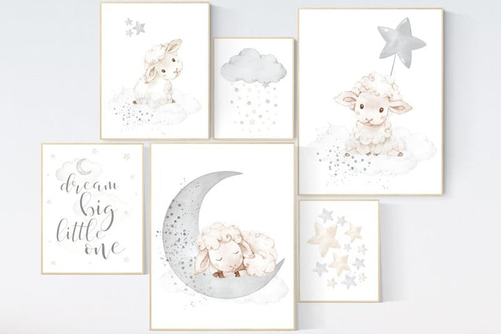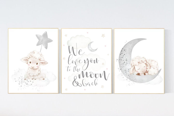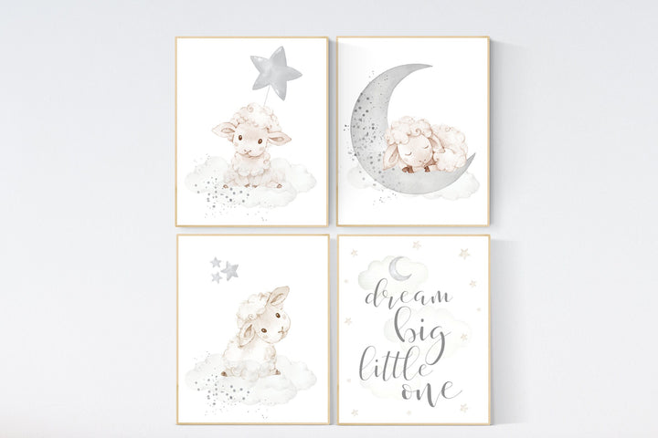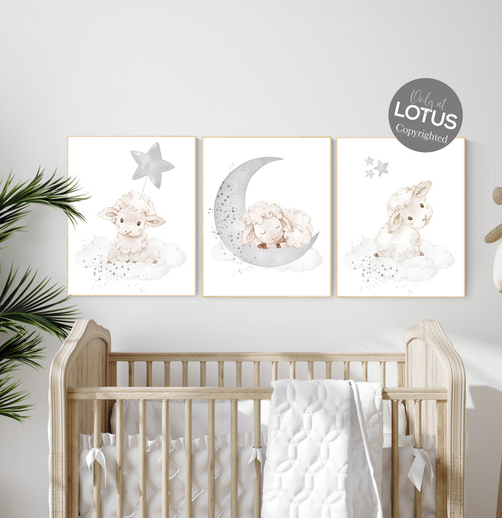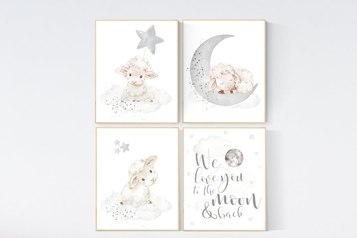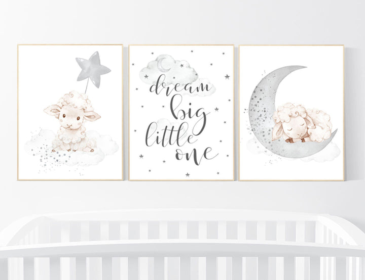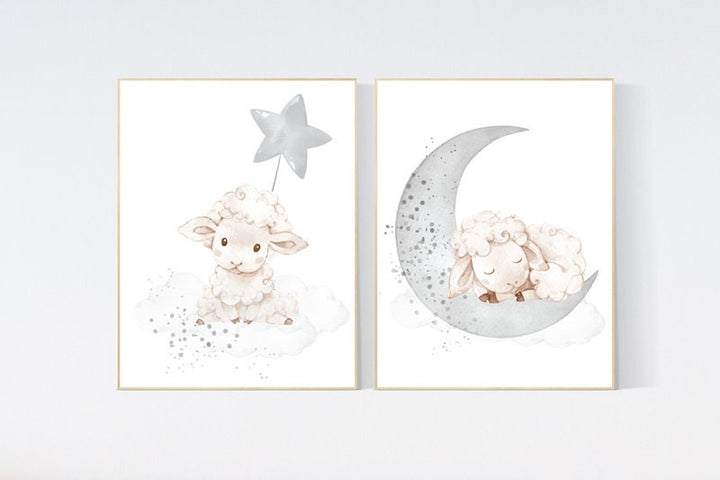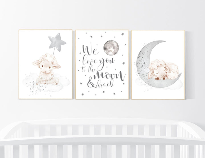 Sheep nursery decor, Gray nursery decor, nursery decor lambs, nursery wall art sheep, moon and cloud wall art nursery gender neutral nursery