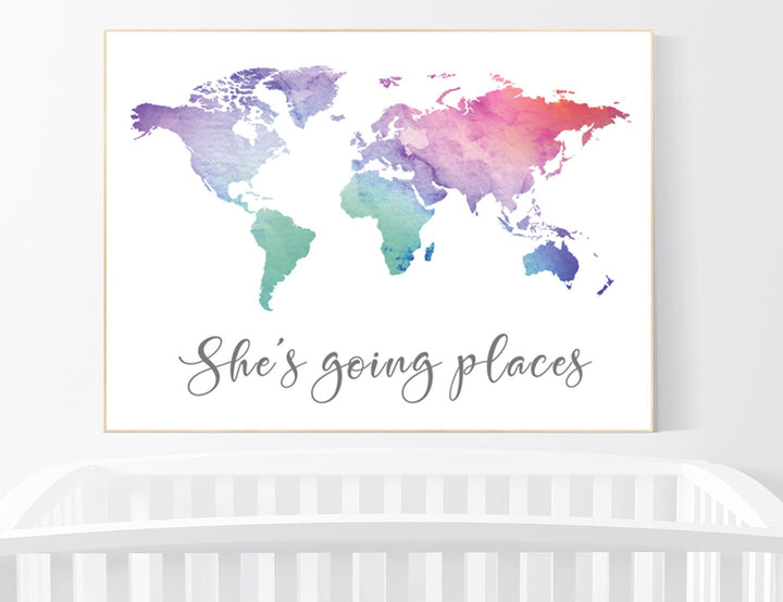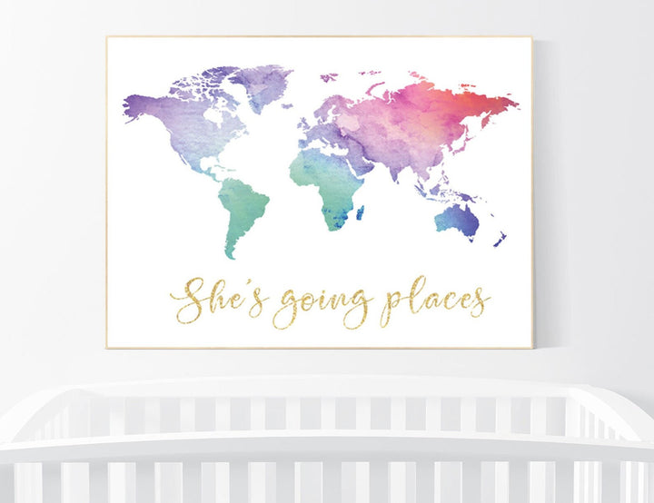 She's going places, World Map poster, world map wall art, nursery wall art, she's going places, pink purple, mint, gold, nursery decor girls