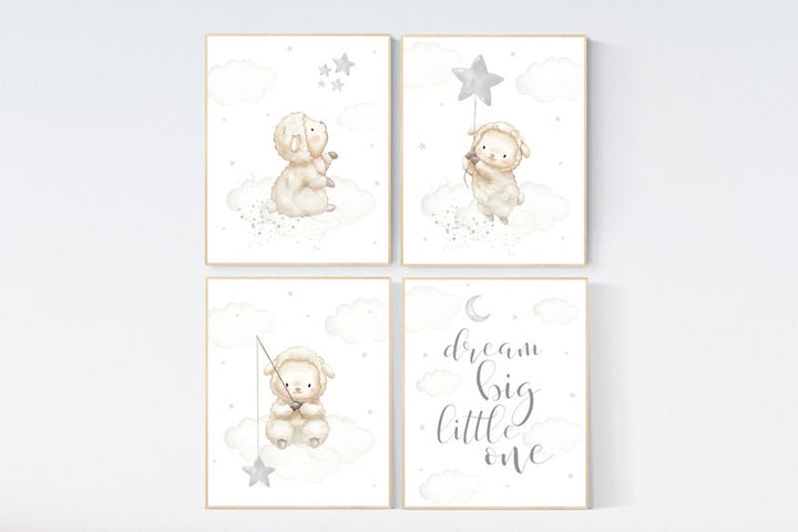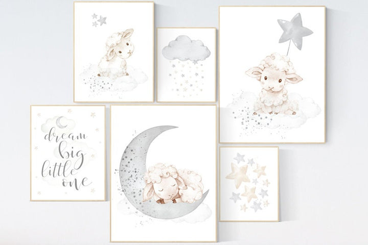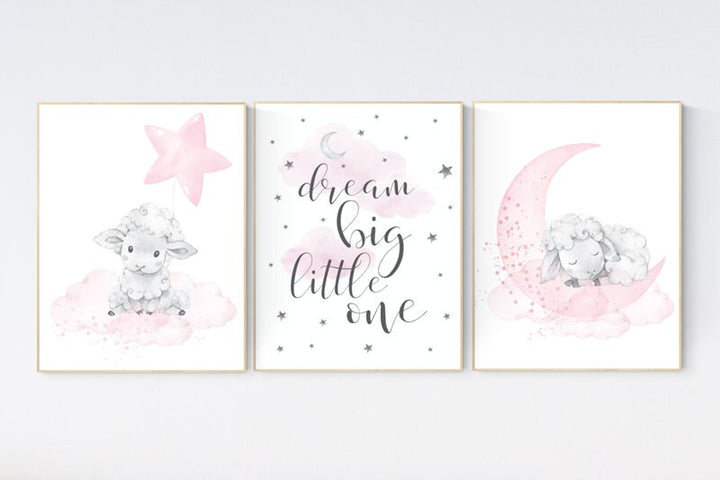 Sheep nursery decor, nursery decor lambs, dream big little one, nursery wall art sheep, moon cloud star nursery, pink gold nursery decor