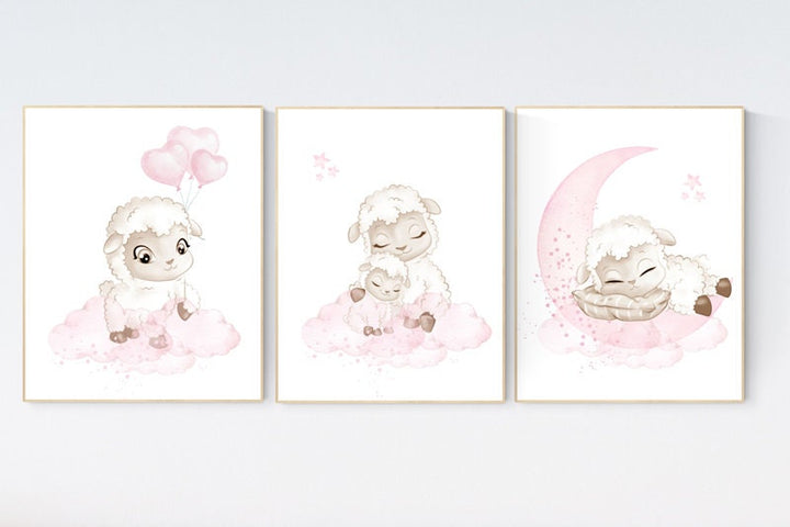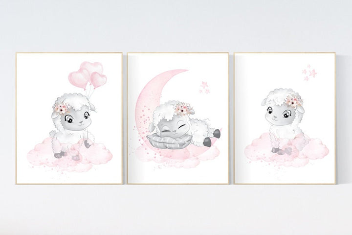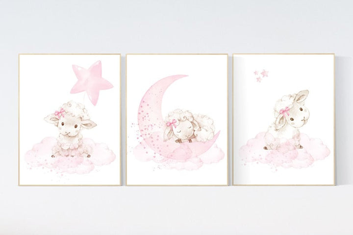 Sheep print nursery, Nursery decor girl, sheep nursery wall art, nursery decor lambs, nursery wall art sheep, moon and cloud, girl nursery
