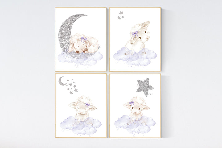 Sheep nursery decor, nursery decor lambs, lavender silver nursery decor, nursery wall art sheep, cloud and star, girl nursery