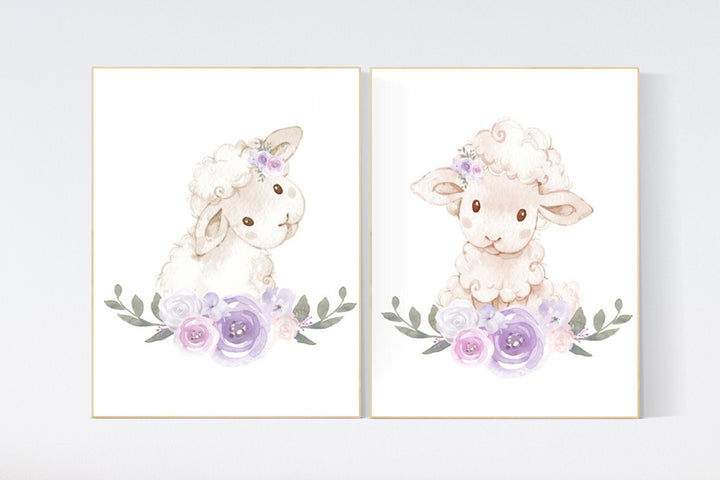Sheep nursery decor, Nursery decor girl, purple and pink, nursery decor lambs, nursery wall art sheep, flower nursery wall art nursery