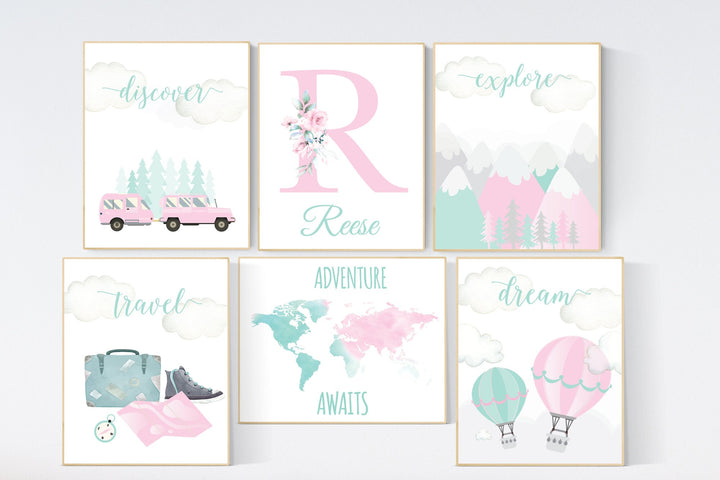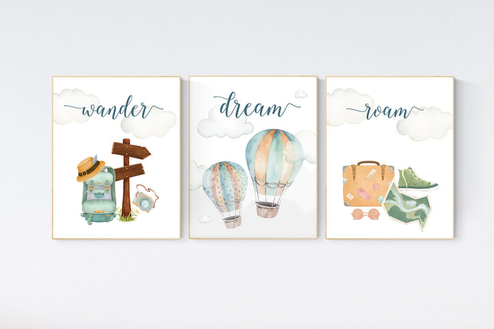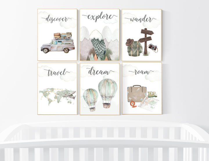 Travel themed nursery, hot air balloon, adventure nursery, mountain, adventure awaits, planes, world map, gender neutral, nursery prints