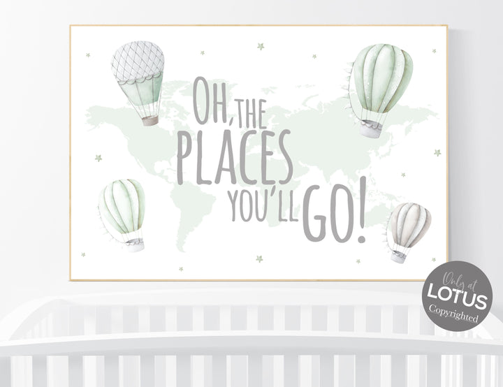 Travel nursery, sage green nursery, hot air balloon, Nursery decor neutral, gender neutral, woodland animals, green nursery, world map