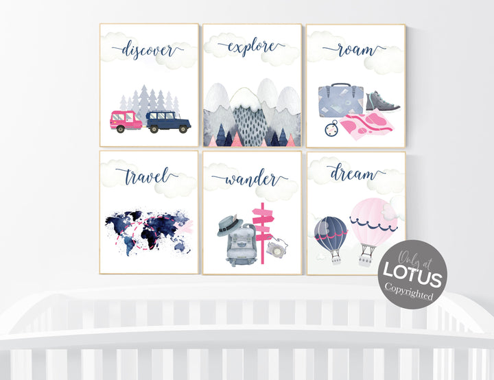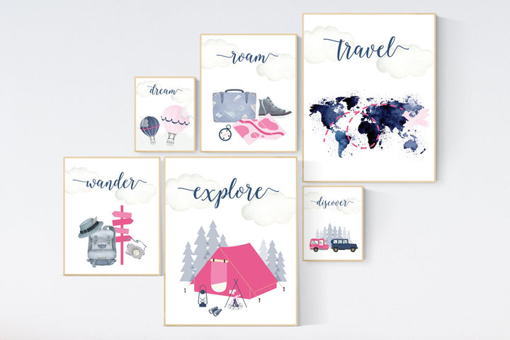 Travel nursery print, Explore nursery wall art, camp nursery, Adventure Set of 6 prints, Camping Prints, navy and pink, woodland nursery