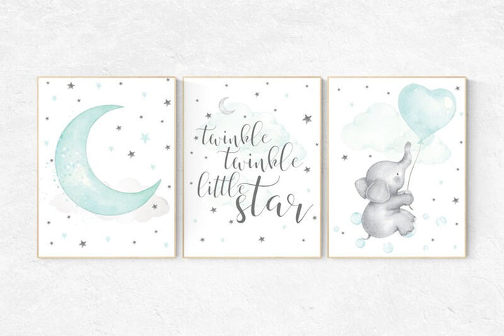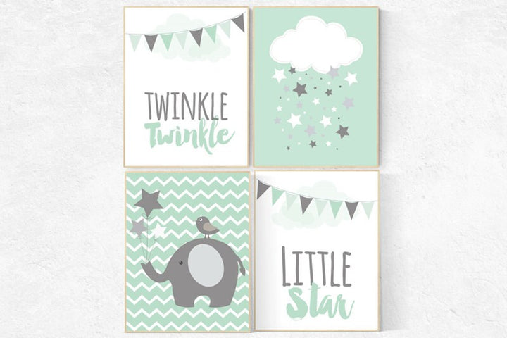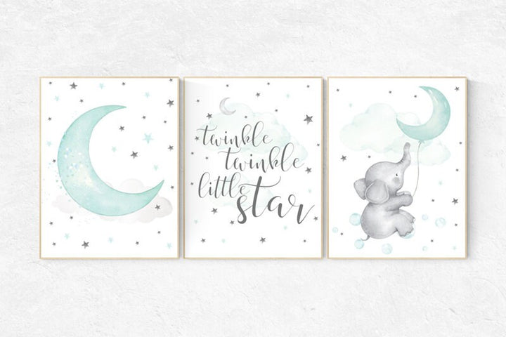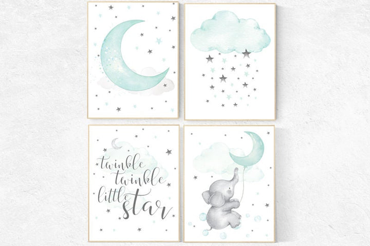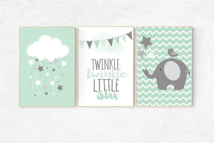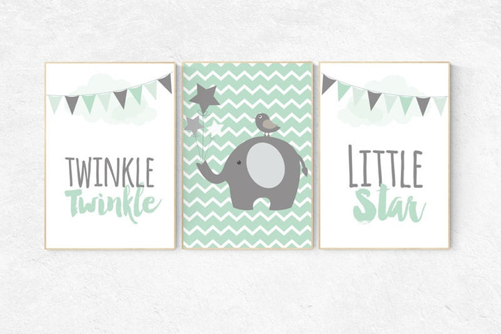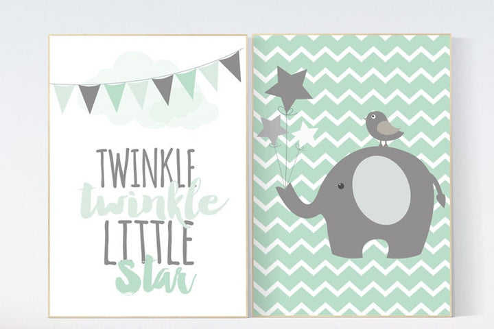 Twinkle Twinkle Little Star, Mint nursery decor, cloud nursery, elephant nursery, gender neutral, Baby Boy, Baby Girl, Nursery Wall Art,