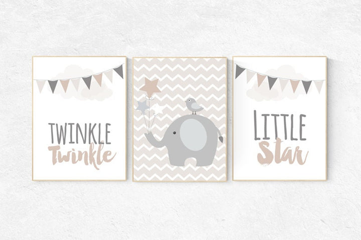 Twinkle twinkle little star, gender neutral nursery, beige and cream, elephant Nursery, Nursery Decor, Gray Beige gender neutral baby shower