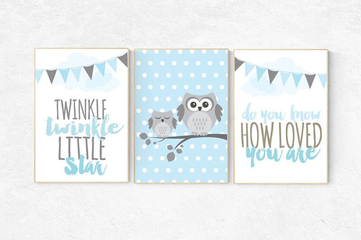 Twinkle Twinkle Little Star, owl nursery art, Baby boy nursery decor, Blue gray nursery, boys room wall art, baby room prints, set of 3, owl