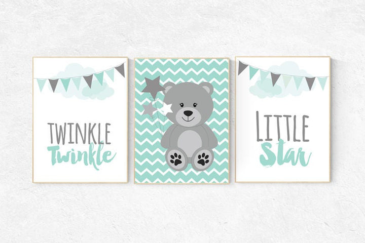 Twinkle Twinkle Little Star, Mint nursery decor, teddy bear nursery, gender neutral baby, Baby Boy Nursery Wall Art, mint gray, mint gray