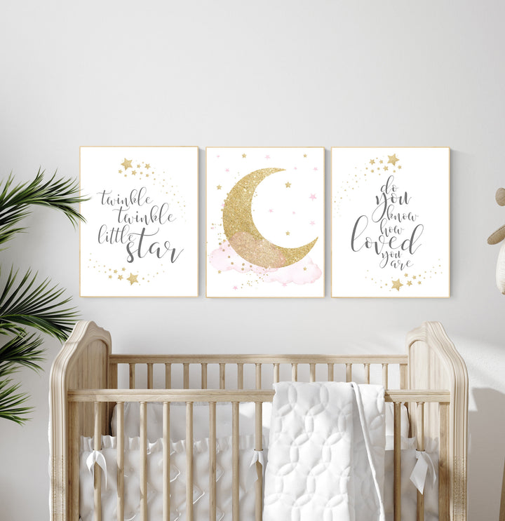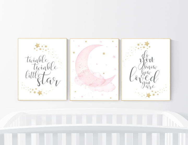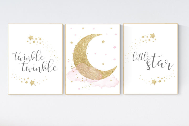 Twinkle twinkle little star, Nursery wall art girl pink gold, baby room decor girl gold and pink, cloud and stars, baby room, moon print