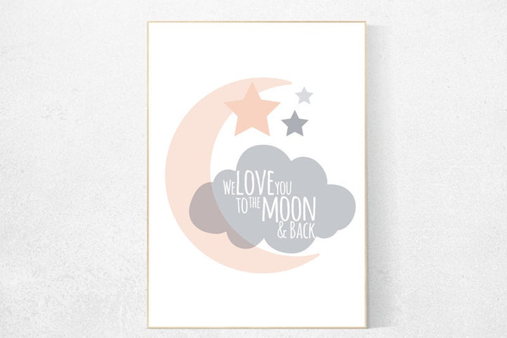 We love you to the moon and back, coral nursery art, blush pink nursery decor, moon nursery, nursery decor girl, pale pink nursery print