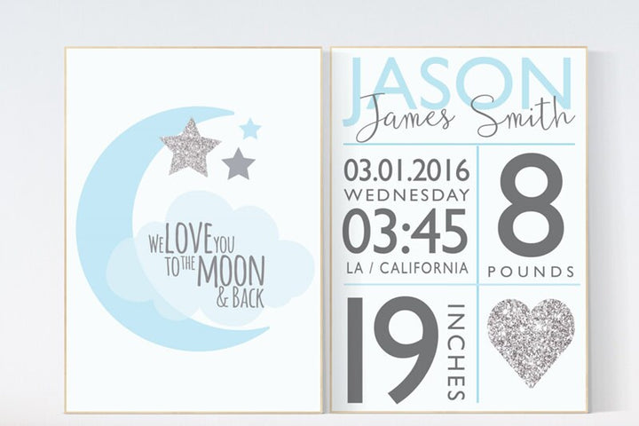 We love you to the moon and back, Baby boy nursery decor, Blue gray nursery, blue silver nursery, Birth stats, new baby gift baby gift ideas