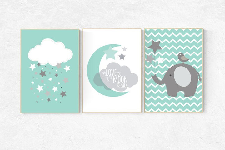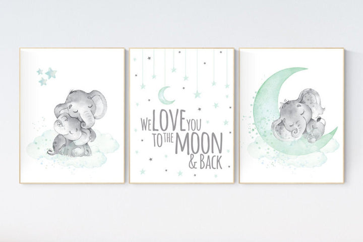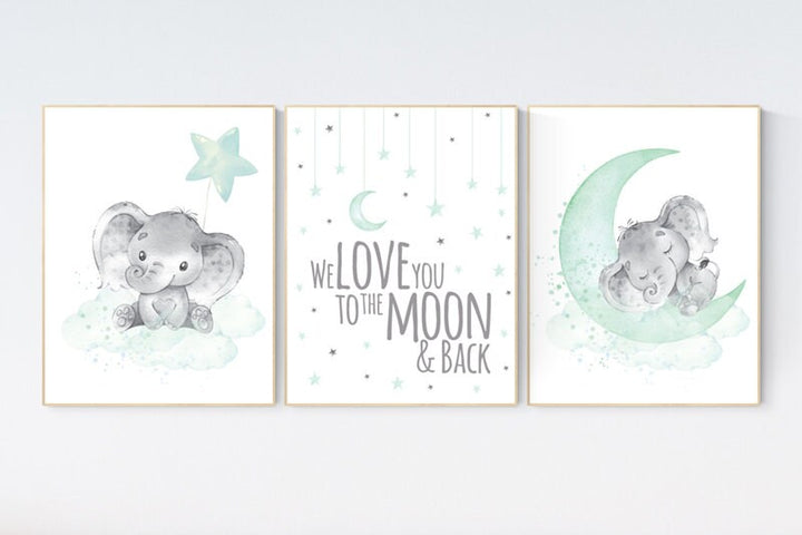 We love you to the moon and back, nursery decor, mint nursery decor, moon nursery, elephant nursery, nursery wall art, baby room wall art