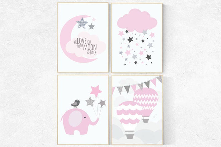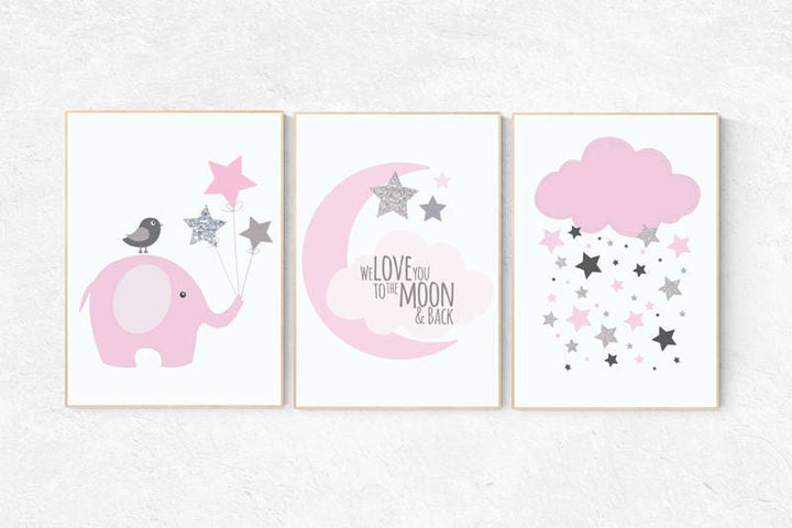We love you to the moon and back, baby girl nursery wall art, pink silver nursery decor, baby girl, pink silver, elephant nursery baby gift