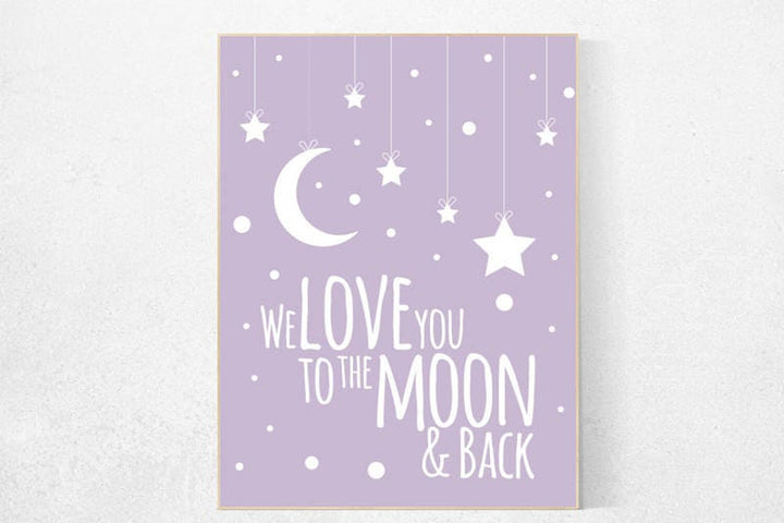 We love you to the moon and back, lilac nursery decor, moon print, nursery wall art, lavender, purple, baby room decor, baby room art purple