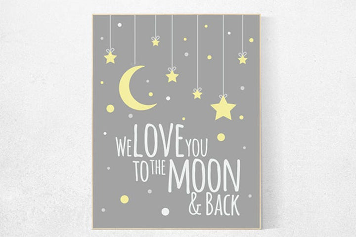 We love you to the moon and back, moon and stars, gender neutral nursery, yellow gray nursery decor, moon and back, nursery wall art, yellow