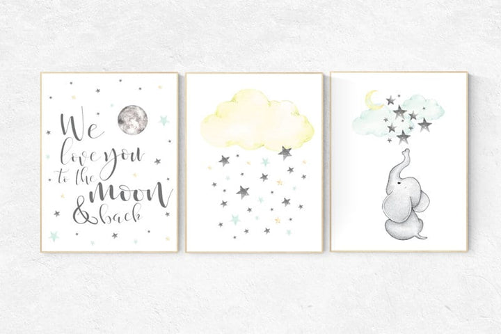 We love you to the moon and back, elephant nursery art, mint yellow nursery, neutral nursery prints, cloud nursery, star nursery decor