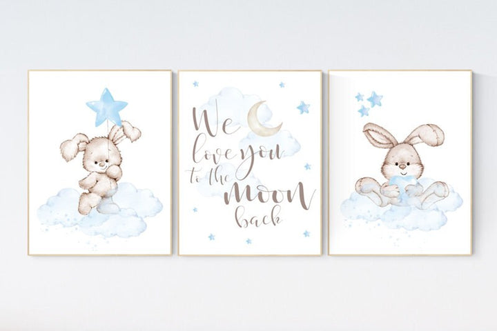 We love you to the moon and back, Nursery decor boy bunny, bunny print set, rabbit nursery decor, boy nursery, Bunny print, boy nursery art