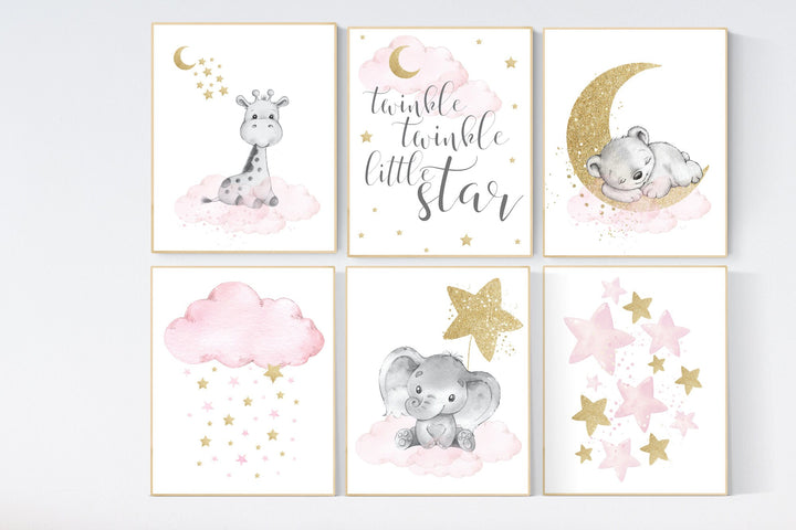 We love you to the moon and back, giraffe elephant, Pink gold nursery, girl room wall art, moon nursery, Nursery decor girl, baby room print