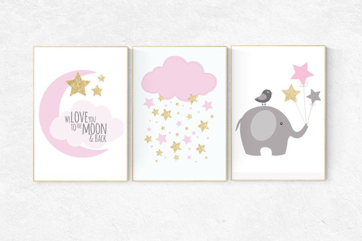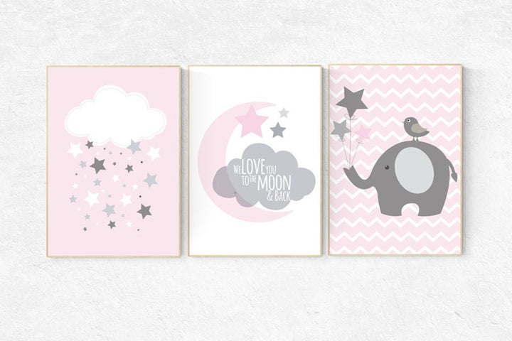 We love you to the moon and back, pink nursery decor, nursery decor, moon nursery, elephant nursery, baby girl nursery wall art, set of 3