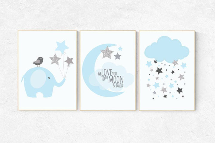 We love you to the moon and stars, nursery, blue gray nursery decor, baby boy nursery, hot air balloon nursery art baby room decor elephant