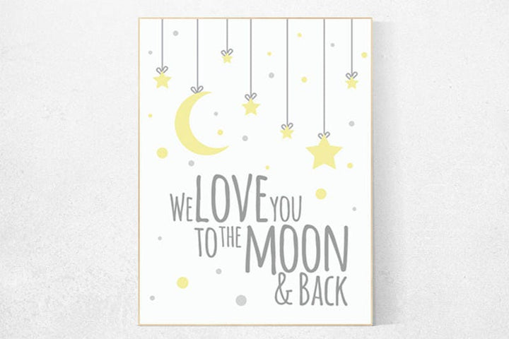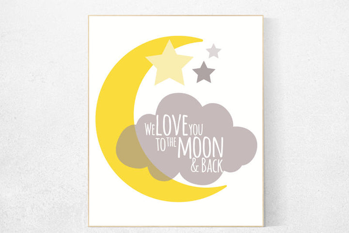We love you to the moon and back, yellow nursery decor, moon and stars, gender neutral nursery, yellow gray nursery decor, nursery wall art