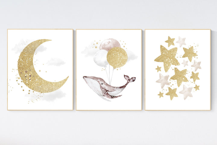 Whale nursery decor, gender neutral nursery, gold nursery, moon and stars, nursery decor nautical, sea theme nursery decor, whale nursery