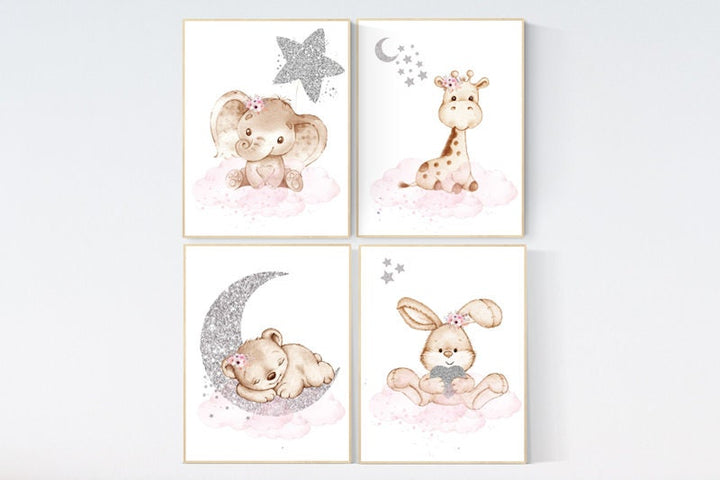 Woodland animals, Nursery decor girl elephant, animal nursery, bunny nursery art, pink silver, bear nursery, giraffe baby room wall art