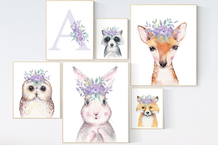 Woodland animals nursery, lilac nursery, woodland nursery decor girl, animal prints for nursery girl, bunny print for girls nursery woodland