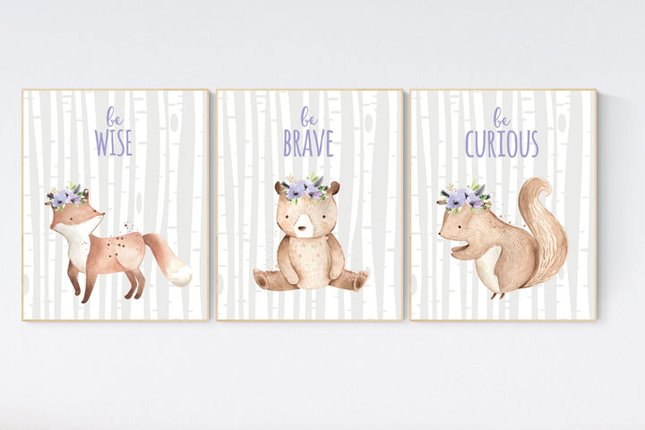 Woodland nursery decor girl, lilac nursery, lavender, purple nursery, woodland animals nursery, fox nursery, nursery art woodland, animal