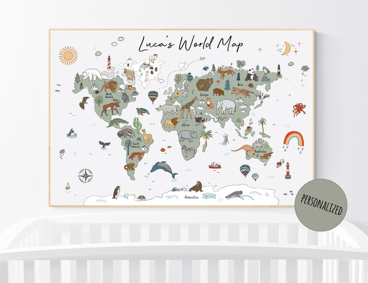 Woodland Animal world map, Nursery Decor, Animal World Map Print, World Map Wall Art, Forest Nursery, Sage Green, World Map With Animals