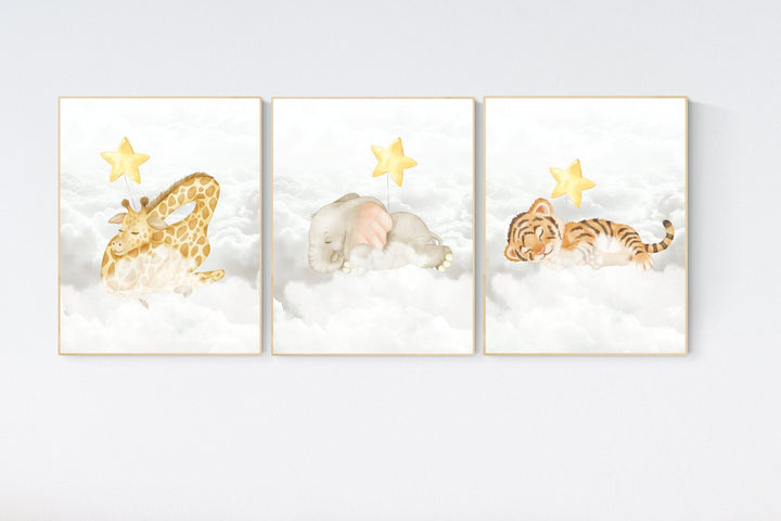 Woodland Animals, Sleeping on Clouds, Woodland Nursery Decor, yellow nursery, Animal Nursery wall art, gender neutral , baby room decor