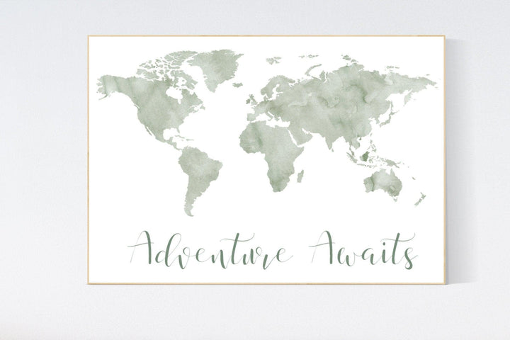 World map nursery, sage green world map, adventure awaits, world map wall art nursery, nursery wall art world map