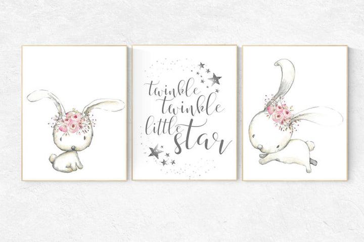 Bunny nursery decor, twinkle twinkle little star, bunny flower crown, nursery decor girl bunny, animal flower crown, nursery prints animals
