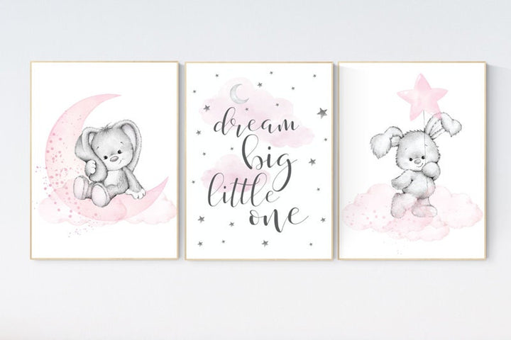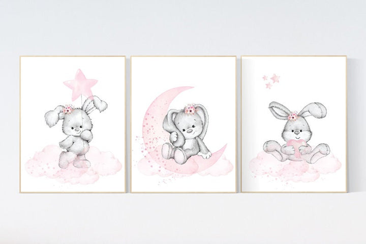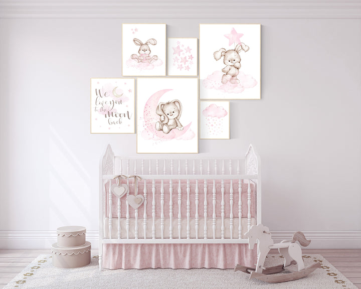 Bunny nursery decor, pink nursery, nursery decor girl bunny, nursery prints animals, we love you to the moon and back, cloud and stars